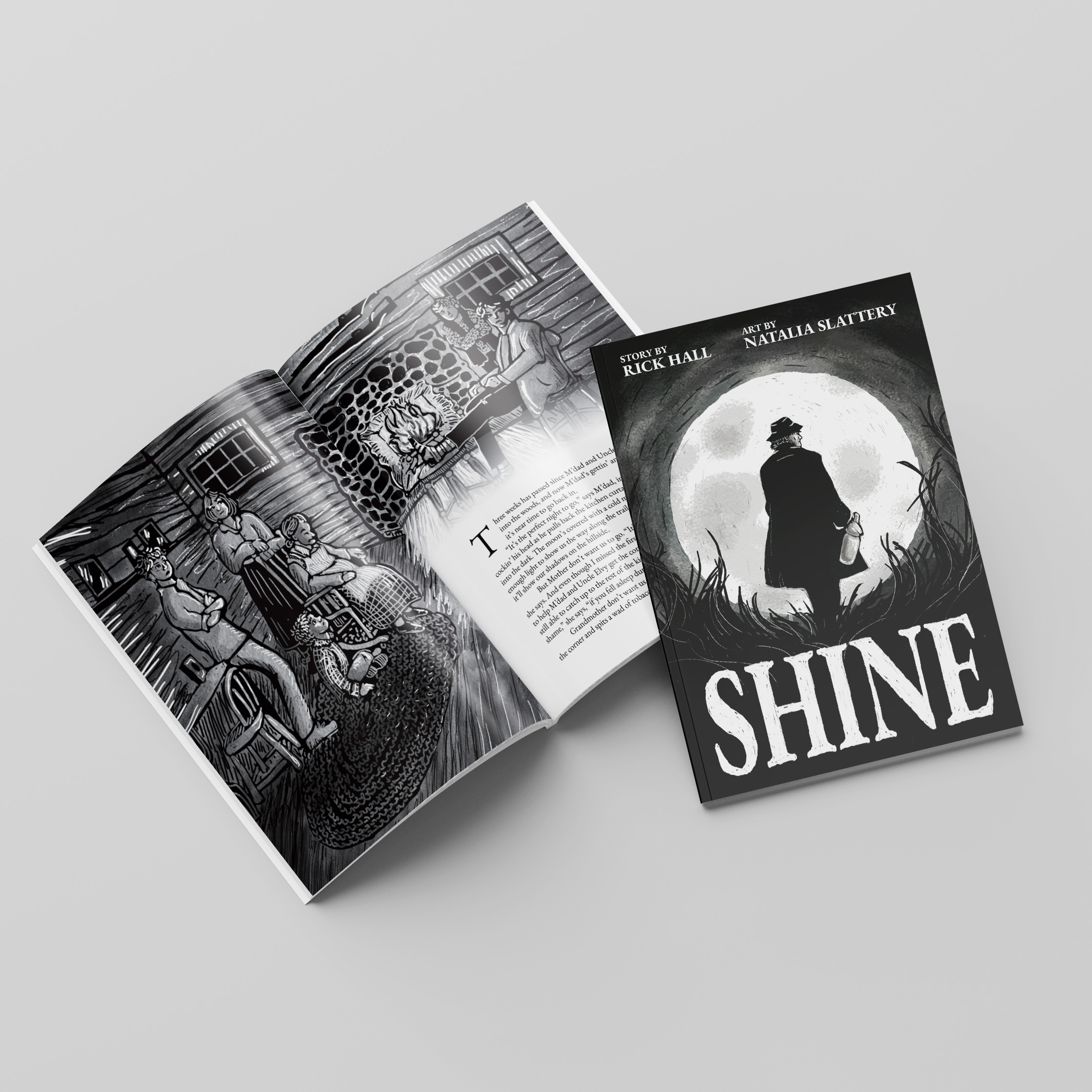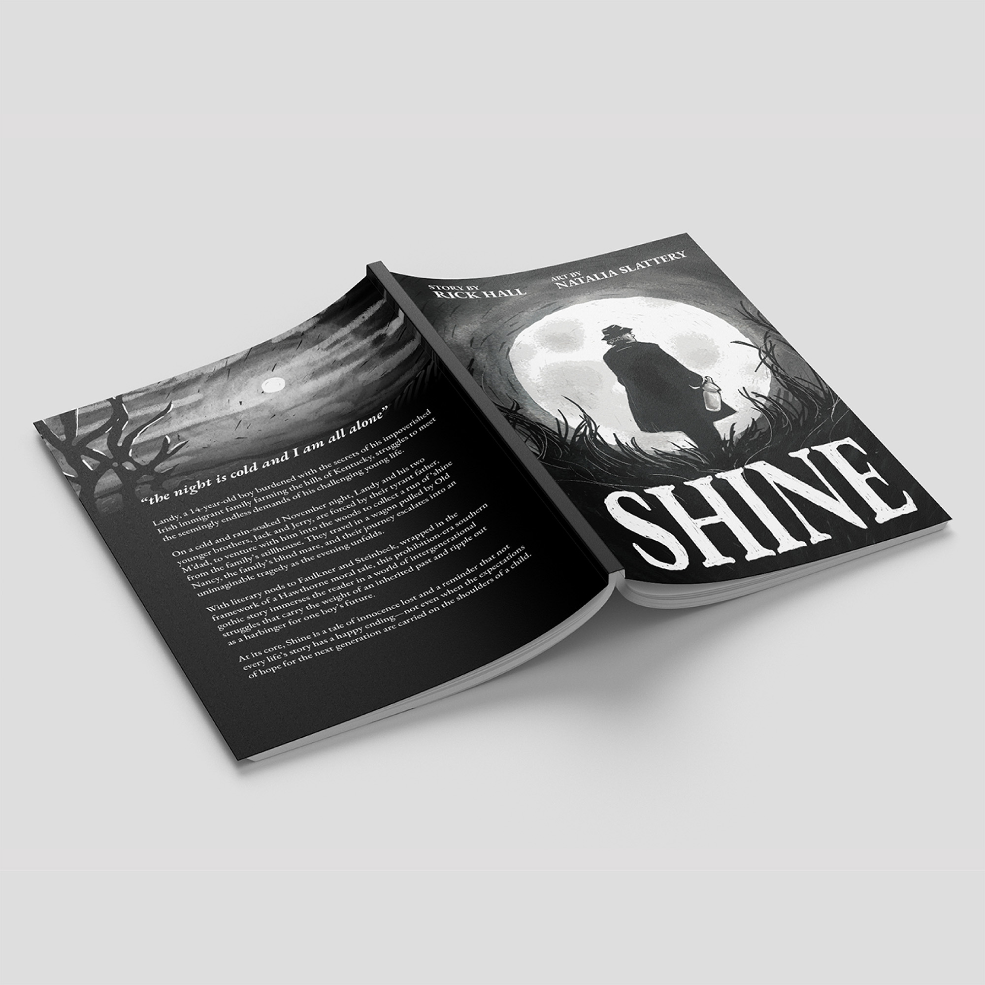 SHINE is a graphic novella and animated radio play, released by myself and author Rick Hall in May 2024. I illustrated and animated the art, and did the layout for the book and marketing materials. You can learn more about the project here: https://shine-thestory.com/